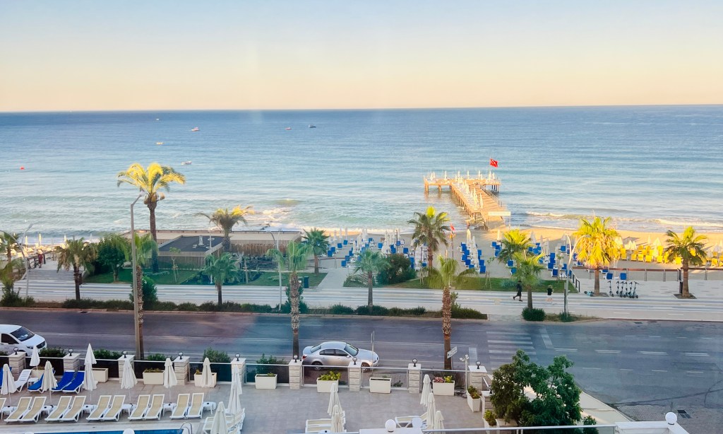 We flew directly into to Antalya, often referred to as the “Gateway to the Turkish Riviera,” a city rich in history, culture, & natural beauty. The city itself is surrounded by breathtaking natural landscapes. The Düden & Kursunlu Waterfalls are popular attractions, while the nearby Taurus Mountains offer opportunities for hiking, skiing, & adventure sports. The region’s beaches, such as Konyaaltı & Lara Beach, are renowned for their beauty & clear waters; many have been awarded the Blue Flag for their cleanliness & environmental standards. This makes it a top destination for beach lovers & water sports enthusiasts. While steeped in history, Antalya also boasts modern amenities & luxury resorts. The city’s tourism infrastructure is well-developed, offering everything from five-star hotels and gourmet restaurants to world-class golf courses and vibrant nightlife. Antalya’s unique blend of historical heritage, natural beauty, and modern comforts makes it a truly captivating destination for travelers.