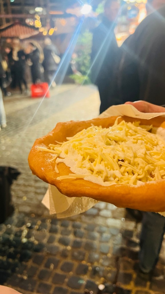Then there’s Lángos, the ultimate comfort food of the Weihnachtsmarkt, with roots that stretch far beyond Germany. Originally from Hungary, Lángos began as a simple bread dough baked on the hot stones of village ovens, often made from leftover dough on bread-baking days. Over time, it evolved into the deep-fried version we know & love today (yes, deep-fried!), spreading across Central Europe & becoming a beloved market staple. At the Weihnachtsmarkt, it arrives golden & sizzling, soft on the inside with crisp edges, generously topped with garlic, sour cream, & cheese. It’s indulgent, messy, & deeply satisfying, the kind of food that feels like a reward for standing in the cold. One bite in, and winter suddenly feels a lot more forgiving.