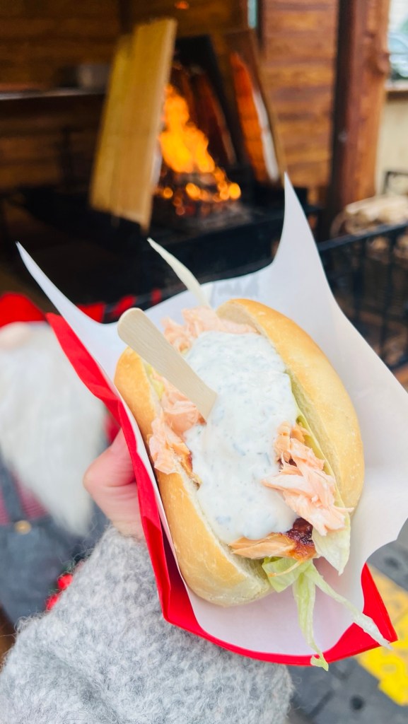 After warming up with Glühwein and Feuerzangenbowle, hunger naturally follows…and the Leipziger Weihnachtsmarkt delivers in the most comforting way possible. Food here isn’t rushed or fancy; it’s hearty, indulgent, & meant to be eaten standing up, hands wrapped around something warm while the cold air sharpens every bite. One of. my favorites, Flammlachsbrötchen is impossible to ignore. Whole sides of salmon are slowly cooked over open flames, crackling & glowing as they roast, filling the air with a smoky, irresistible aroma. Once perfectly tender, the salmon is tucked into a crusty roll, often with a simple sauce that lets the fish shine. Watching it cook is half the experience…fire, warmth, & anticipation all in one, and it’s no surprise the Swiss Village always draws a crowd.