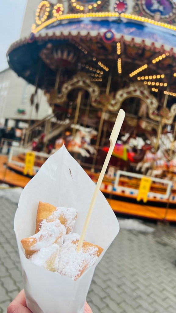 Over the years, it truly grew into one of my favorite parts of the season. I fell in love with the glow of the lights against dark December skies, the way cold air sharpens the senses, and especially how a mug of hot Glühwein warms you from the inside out. I love how people gather, young & old, locals & visitors, laughing, catching up, sharing food, standing shoulder to shoulder despite the cold. It gets wild quickly, in the best possible way, & most people don’t realize just how strong that warm, spiced wine really is. Add in comforting favorites like Klöße mit Soße, crispy Lángos, & freshly roasted nuts, and suddenly winter feels less like something to endure & more like something to celebrate.